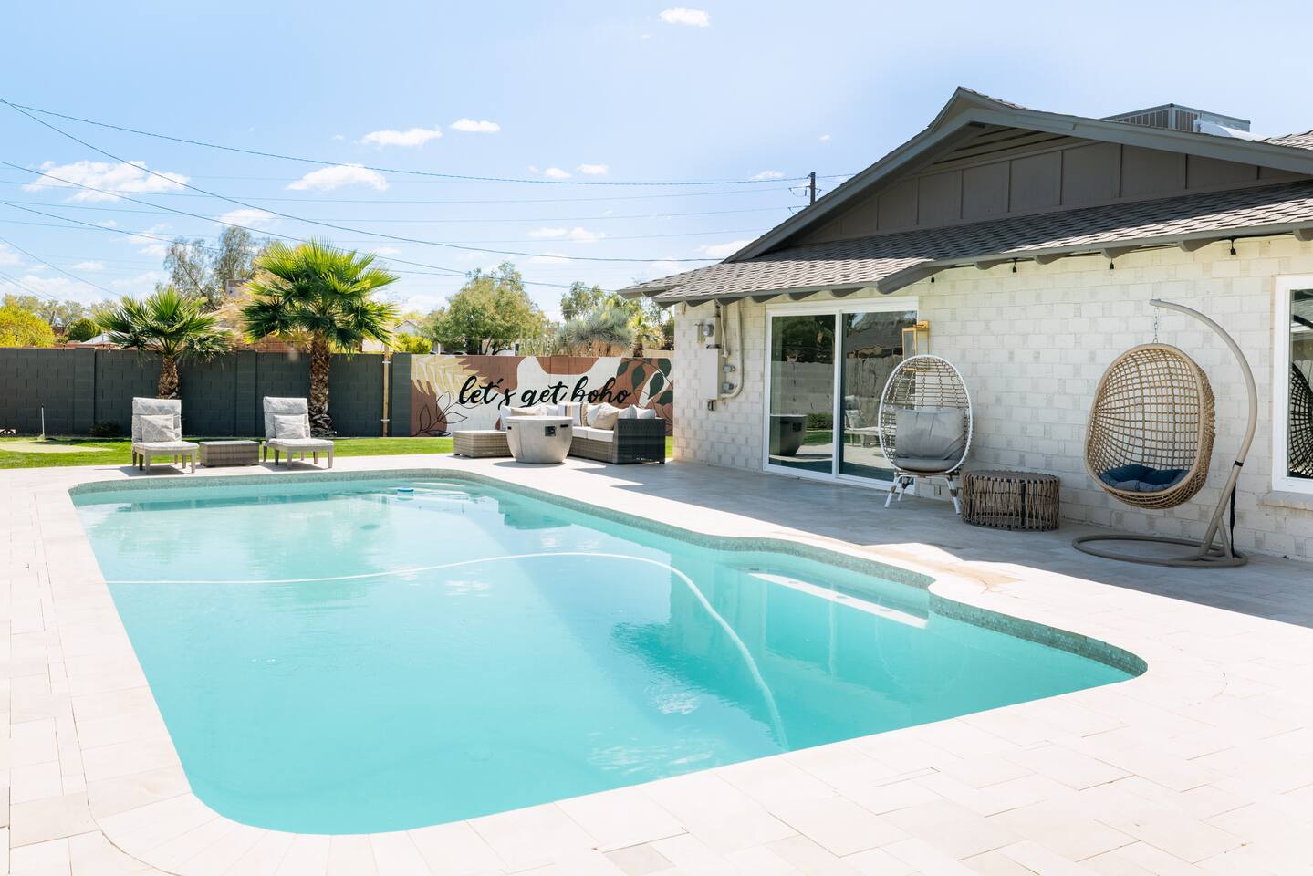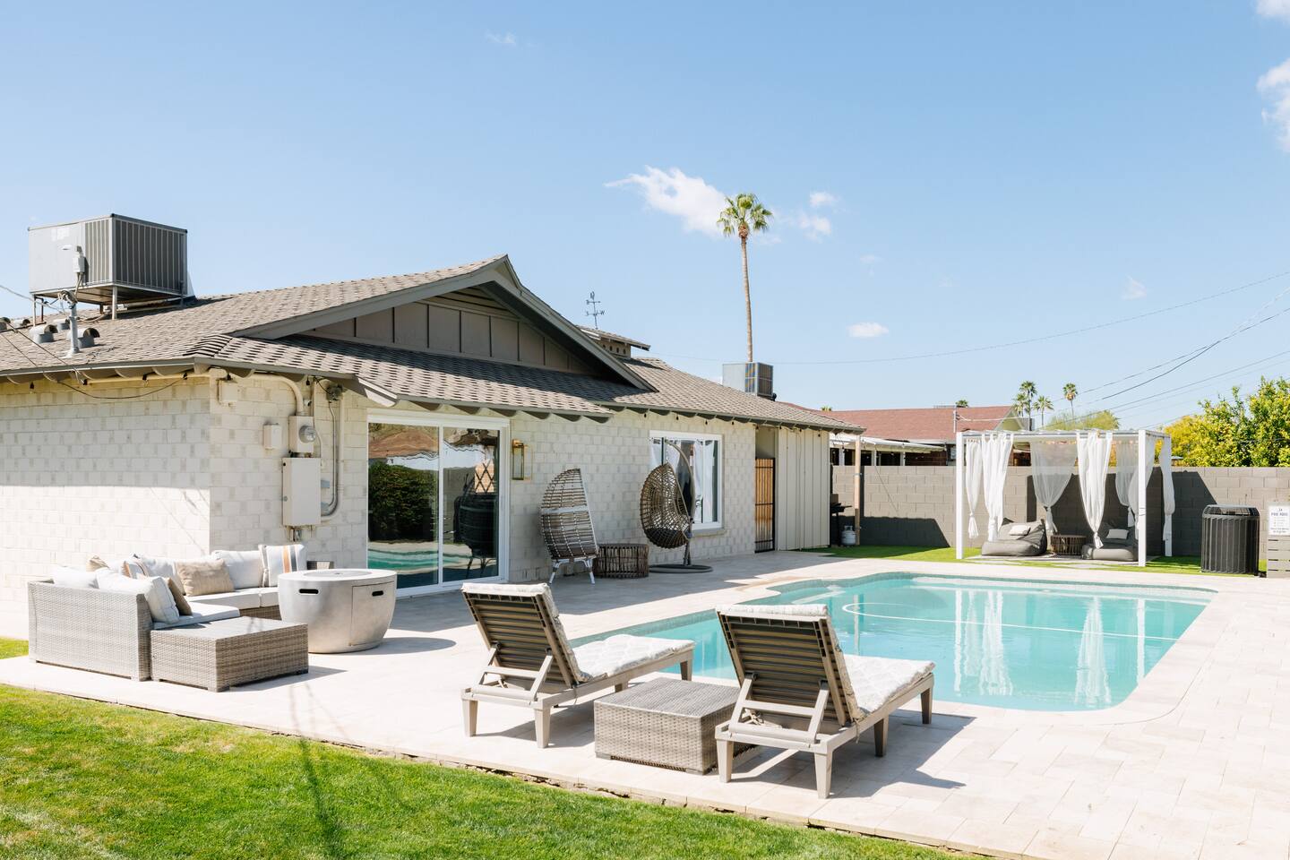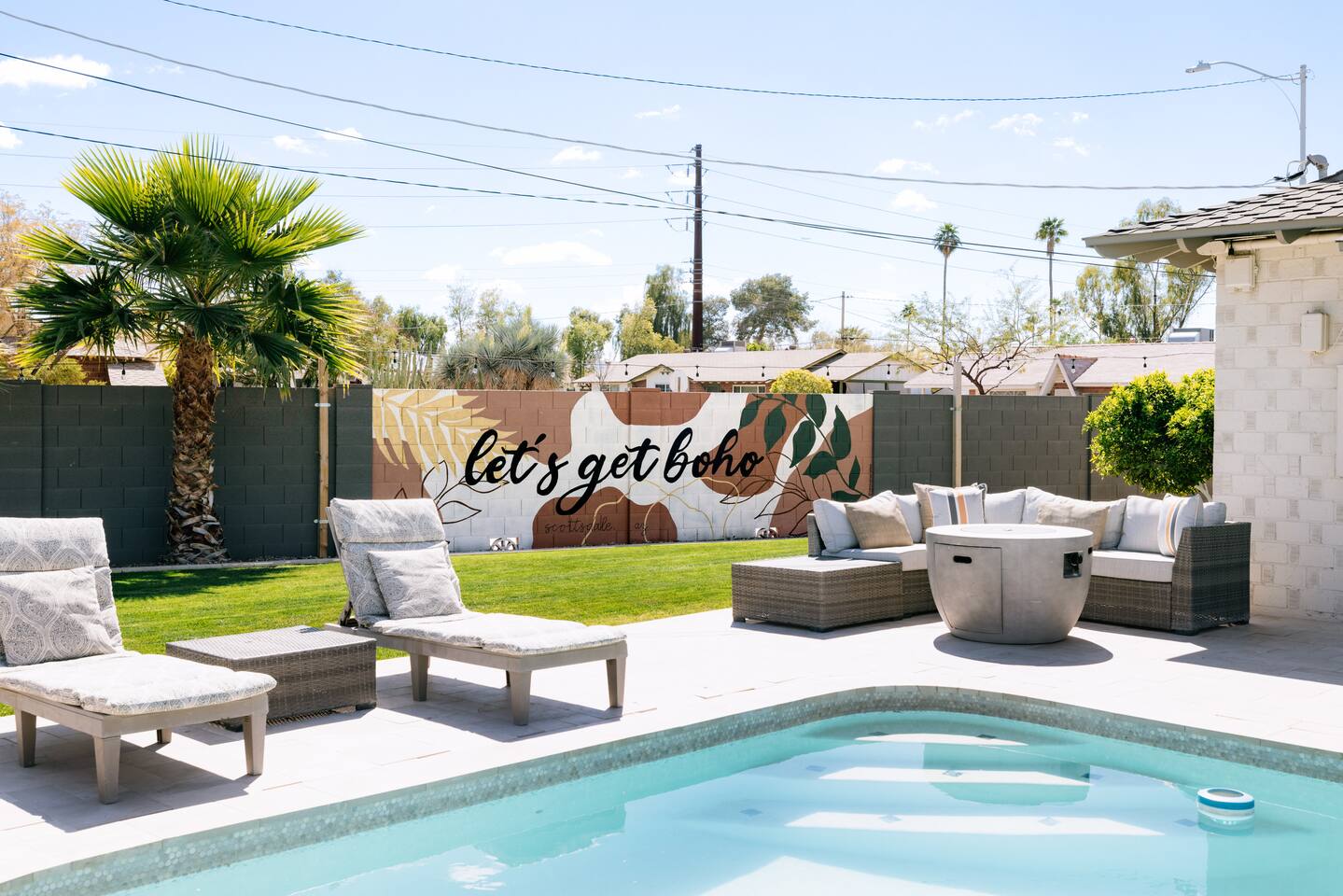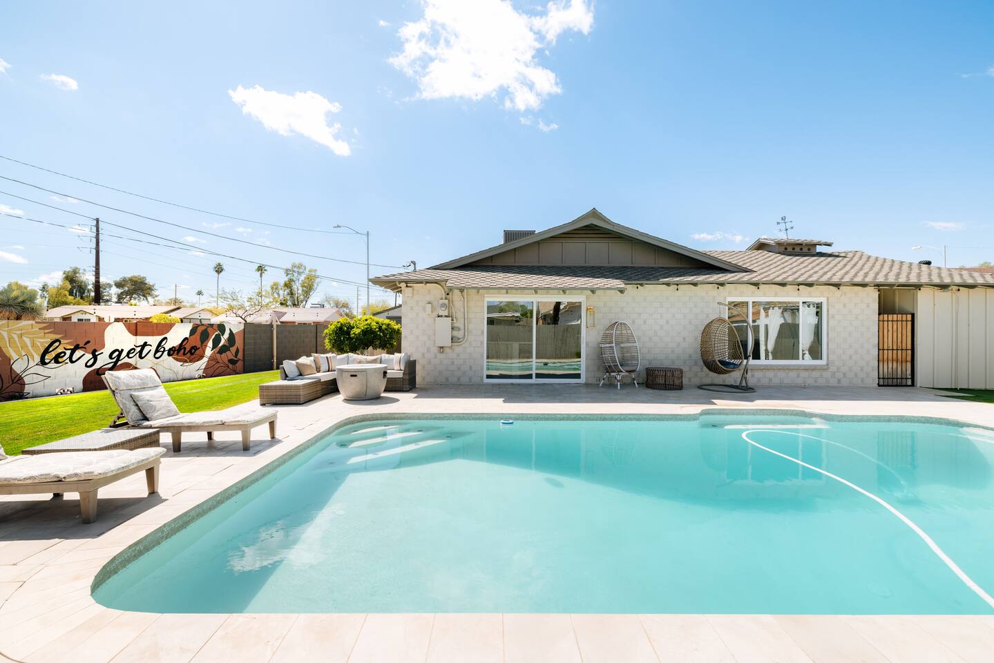 As you step inside, you'll be greeted by a beautifully renovated interior featuring designer tile in both bathrooms, brand new finishes, and a kitchen that boasts cream shaker cabinets, quartz countertops, bar seating, and stainless steel appliances. The kitchen seamlessly flows into the dining and living areas, making it perfect for entertaining guests or enjoying a quiet night in. Outside, you'll find a luxurious pool and a green lawn, creating a backyard oasis that's perfect for relaxing or soaking up the Arizona sun. Charming touches like window seats, wood plank tile, and bright walls tie it all together, creating a warm and inviting atmosphere. Whether you're here for a weekend getaway or an extended stay, our home offers the perfect blend of comfort and convenience for your stay in Scottsdale. We can't wait to host you!