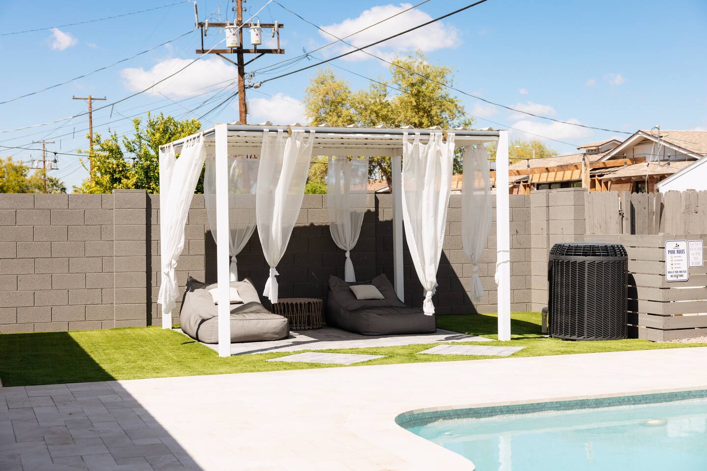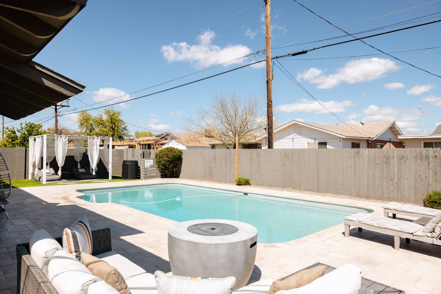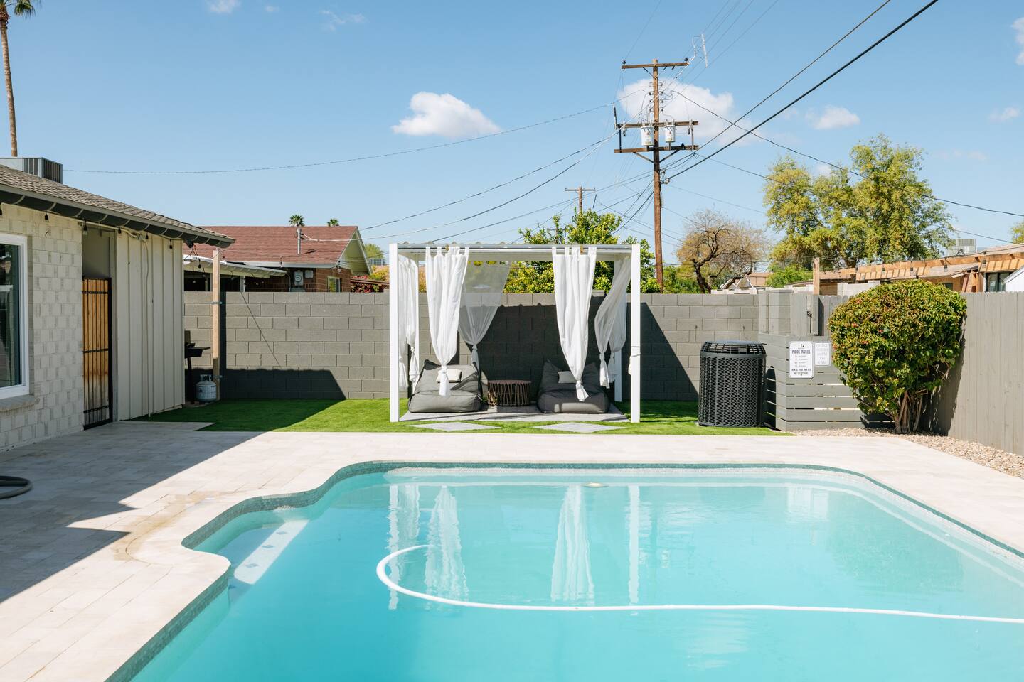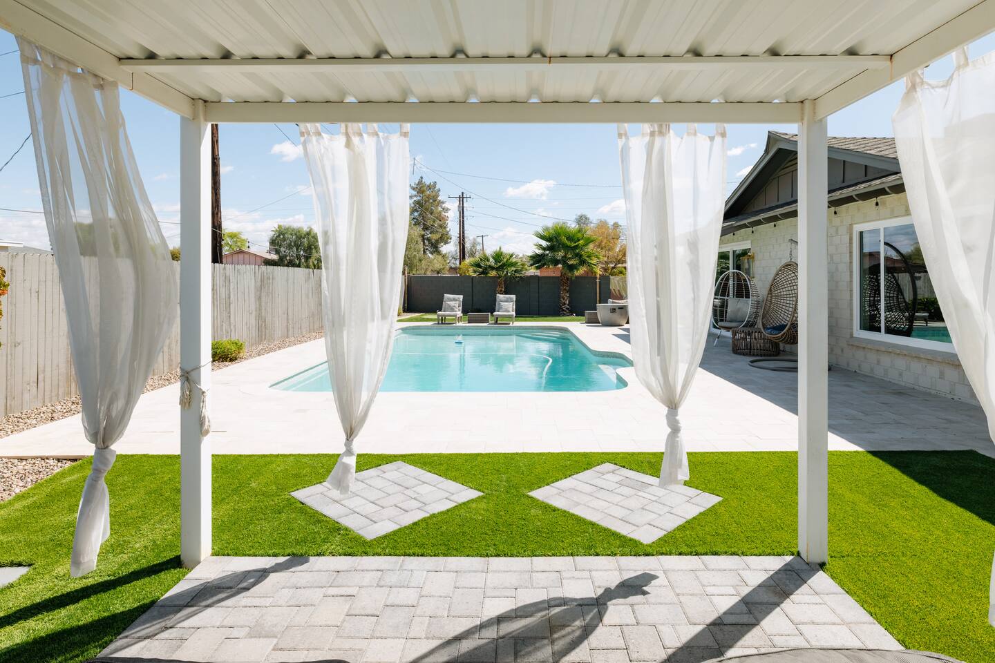 As you step inside, you'll be greeted by a beautifully renovated interior featuring designer tile in both bathrooms, brand new finishes, and a kitchen that boasts cream shaker cabinets, quartz countertops, bar seating, and stainless steel appliances. The kitchen seamlessly flows into the dining and living areas, making it perfect for entertaining guests or enjoying a quiet night in. Outside, you'll find a luxurious pool and a green lawn, creating a backyard oasis that's perfect for relaxing or soaking up the Arizona sun. Charming touches like window seats, wood plank tile, and bright walls tie it all together, creating a warm and inviting atmosphere. Whether you're here for a weekend getaway or an extended stay, our home offers the perfect blend of comfort and convenience for your stay in Scottsdale. We can't wait to host you!