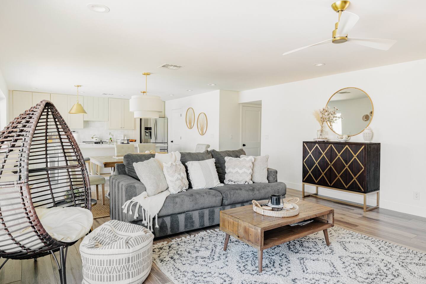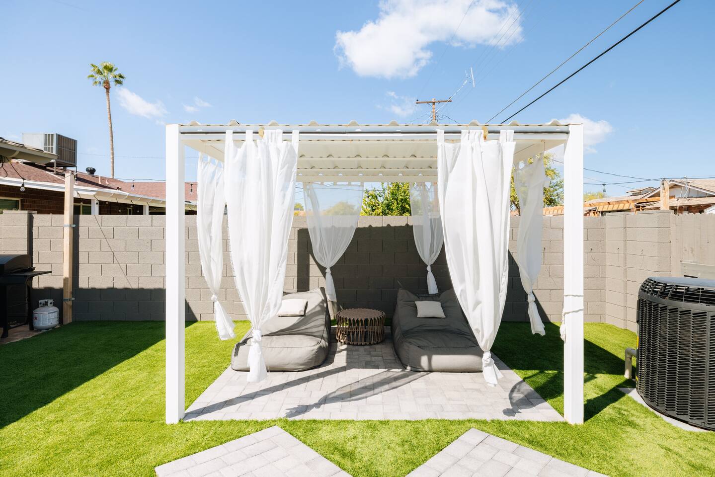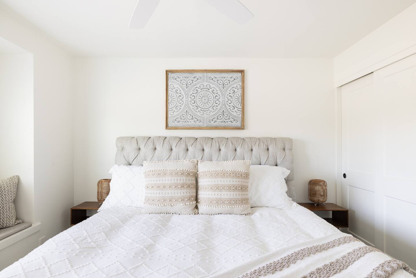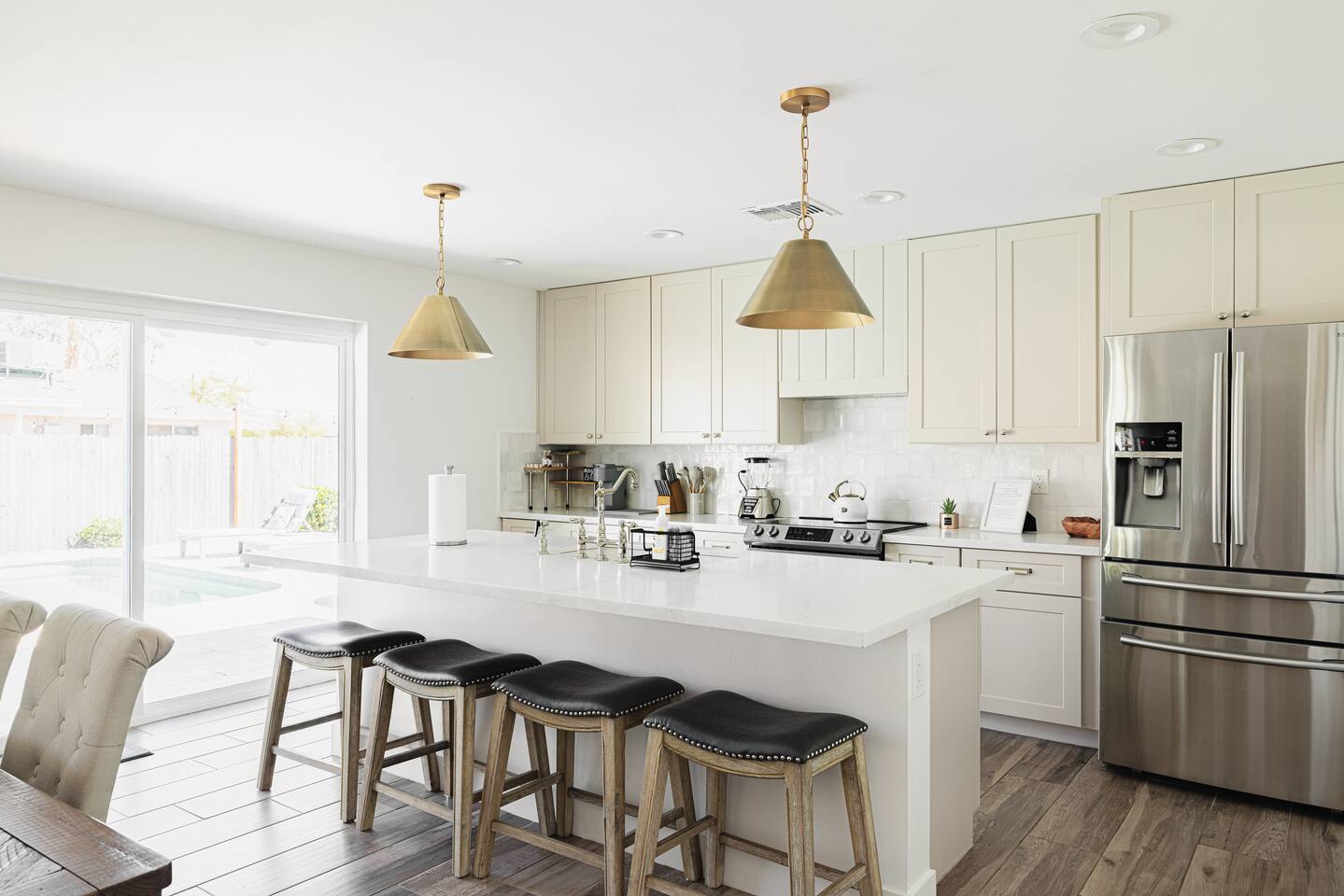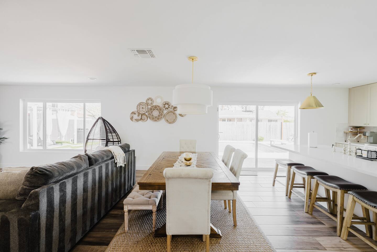 As you step inside, you'll be greeted by a beautifully renovated interior featuring designer tile in both bathrooms, brand new finishes, and a kitchen that boasts cream shaker cabinets, quartz countertops, bar seating, and stainless steel appliances. The kitchen seamlessly flows into the dining and living areas, making it perfect for entertaining guests or enjoying a quiet night in. Outside, you'll find a luxurious pool and a green lawn, creating a backyard oasis that's perfect for relaxing or soaking up the Arizona sun. Charming touches like window seats, wood plank tile, and bright walls tie it all together, creating a warm and inviting atmosphere. Whether you're here for a weekend getaway or an extended stay, our home offers the perfect blend of comfort and convenience for your stay in Scottsdale. We can't wait to host you!
