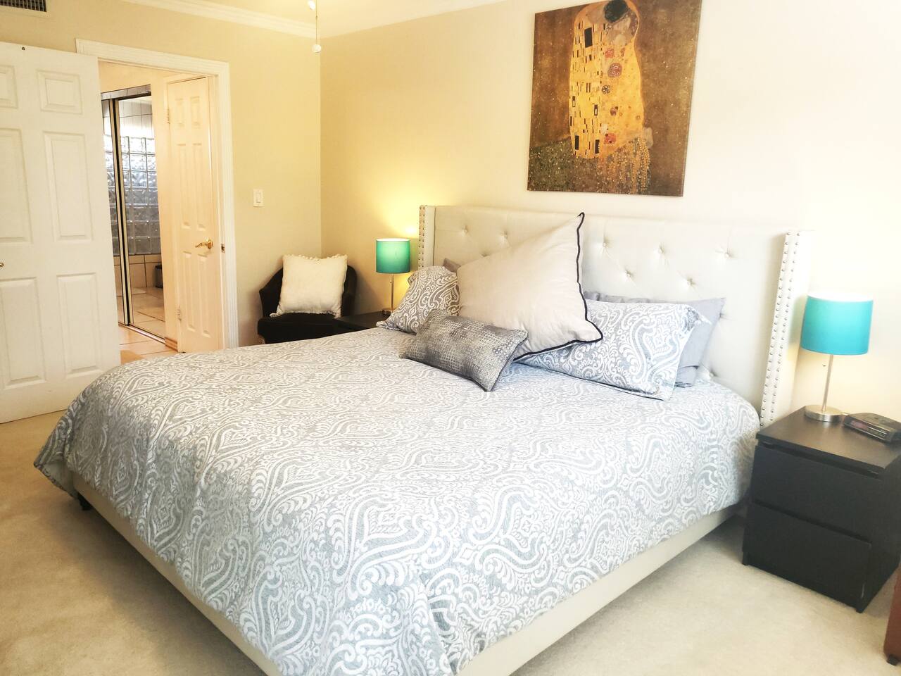 This residence features a spacious living room with 20-foot ceilings and expansive windows, creating a bright and inviting atmosphere. It offers three generously sized bedrooms, each with a queen-size bed, ample closet space, and a private full bathroom. The modern kitchen boasts granite countertops, a skylight, and is fully equipped for all your culinary needs. A separate laundry room houses a full-size washer and dryer. The dedicated dining area comfortably accommodates six guests. Enjoy high-speed wireless internet, and unwind with a flat-screen cable TV in the living room and master bedroom, offering access to Netflix, premium channels (HBO, Showtime, Cinemax), and an extensive selection of over 100 local and national channels. Step outside your door and enjoy the convenience of a shared pool.